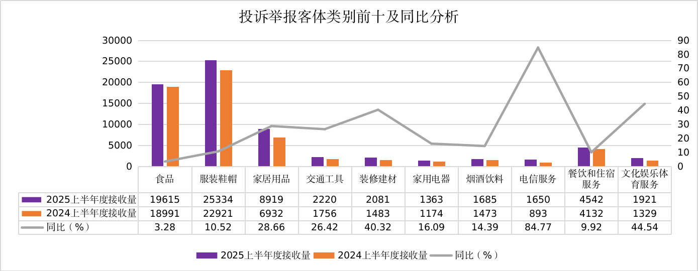 从赞扬问题类别看,涉及的产物品种以鞋服、食物和家居用品为从。服拆鞋帽类赞扬举报同比增加10.52%,